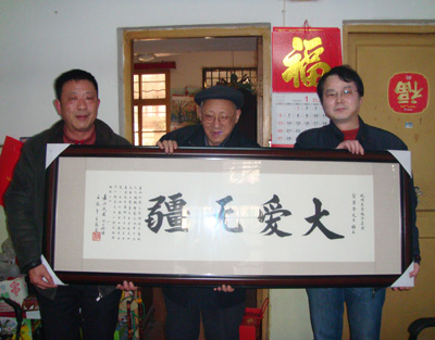 嘉興的民建會員付乃池老人70多歲了,以前患有嚴重的高血壓和哮喘病,家中經濟困難,無法有效醫治,有了東華的資助金,他積極進行治療,身體得到很好康復。看到慰問組的人員,他流下了感激的淚水,還特地做了一幅“大愛無疆”的匾額送給宣董事長。旁題:君以仁愛之長期結對幫扶眾人,慷慨解囊,人均年萬余元。吾乃耄耋之年,貧病交加,喜得先生資助,月月如是,年復一年,恰似春風甘露,老朽得以頤養天年,不勝感激,僅聊表寸心。表達了他的感激之情。