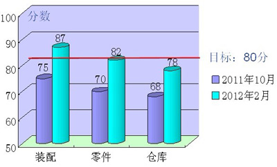開展檢查評(píng)比,落實(shí)持續(xù)改善 事業(yè)部不定期對(duì)各部門的改善活動(dòng)進(jìn)行檢查評(píng)價(jià),每月至少2次,覆蓋所有單位區(qū)域,通過(guò)TPS專員和組員的聯(lián)合檢查評(píng)價(jià),利用《5S評(píng)分表》進(jìn)行打分排名并對(duì)改善滯后的員工進(jìn)行再培訓(xùn)并達(dá)到標(biāo)準(zhǔn),對(duì)活動(dòng)開展積極,效果明顯的進(jìn)行獎(jiǎng)勵(lì),激勵(lì)各單位持續(xù)做好改善工作。檢查評(píng)比把重點(diǎn)放在現(xiàn)場(chǎng)的掌握上,通過(guò)現(xiàn)場(chǎng)檢查發(fā)現(xiàn)的問(wèn)題被納入事業(yè)部5S、TPS 的改善對(duì)象,列入改善計(jì)劃,落實(shí)具體改善措施,整個(gè)活動(dòng)基本進(jìn)入“有檢查、有措施、有落實(shí)”的良性循環(huán)。目前現(xiàn)場(chǎng)整體效果良好,基本實(shí)現(xiàn)了現(xiàn)場(chǎng)清爽、分類清楚、定置有序的目標(biāo),進(jìn)一步提升了現(xiàn)場(chǎng)可視化效果。