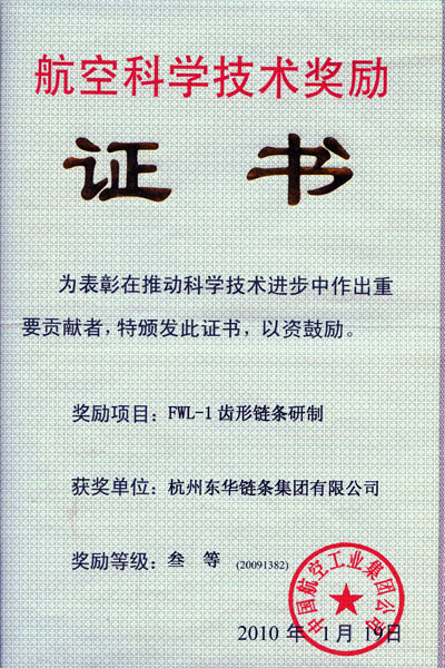 近年來,東華集團(tuán)研制的FWL-1齒形鏈條產(chǎn)品是首款用于航空器上的鏈條產(chǎn)品,故要求極高的可靠性和壽命。對該產(chǎn)品的開發(fā)受到軍方的高度關(guān)注,分別經(jīng)過了軍方的首次開發(fā)技術(shù)鑒定、首款產(chǎn)品樣件鑒定和量產(chǎn)件產(chǎn)品技術(shù)鑒定等三個階段,歷時三年。該航空鏈條的成功開發(fā)填補(bǔ)了國內(nèi)航空領(lǐng)域用鏈條的技術(shù)空白,打破了以往該類產(chǎn)品長期依賴進(jìn)口,被國外技術(shù)壟斷的局面,成功取代進(jìn)口,為中國的國防建設(shè)做出了突出貢獻(xiàn)。