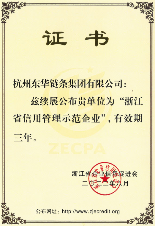 日前,浙江省企業(yè)信用促進(jìn)會公布了2022年度續(xù)展“浙江省信用管理示范企業(yè)”的決定,東華鏈條集團(tuán)成功續(xù)展。